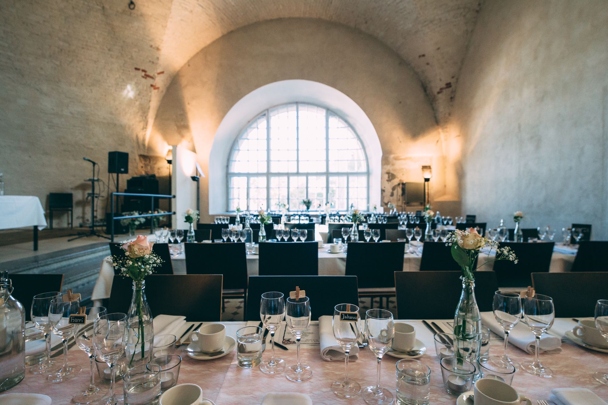 Myllysali on yksi Suomenlinnan suosituimmista hääpaikoista, eikä ihme! Korkeat katot, holvikaaren reunustama kookas ikkuna, pehmeä kuvausvalo, erillinen esiintymislava hääparille tai esityksille... Mitä muuta voi hääpaikalta toivoa?