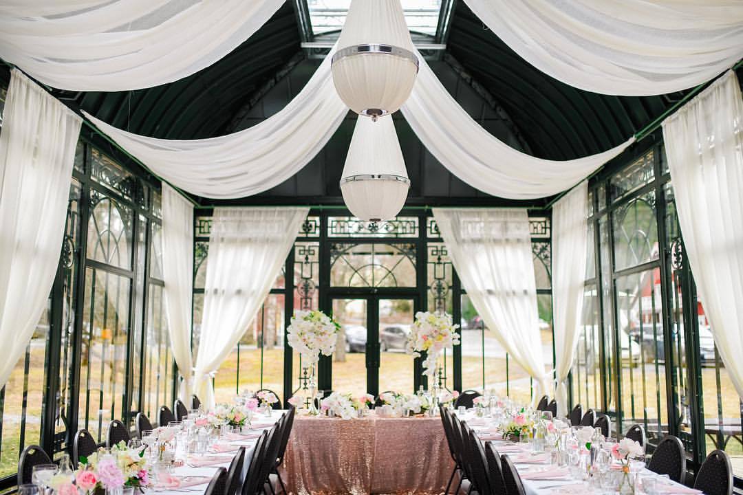 Huikean korkeat katot, lattiasta kattoon ulottuvat ikkunat, kattokruunut ja luksustunnelma mahtuvat mielettömään lasipaviljonkiin kuin itsestään.