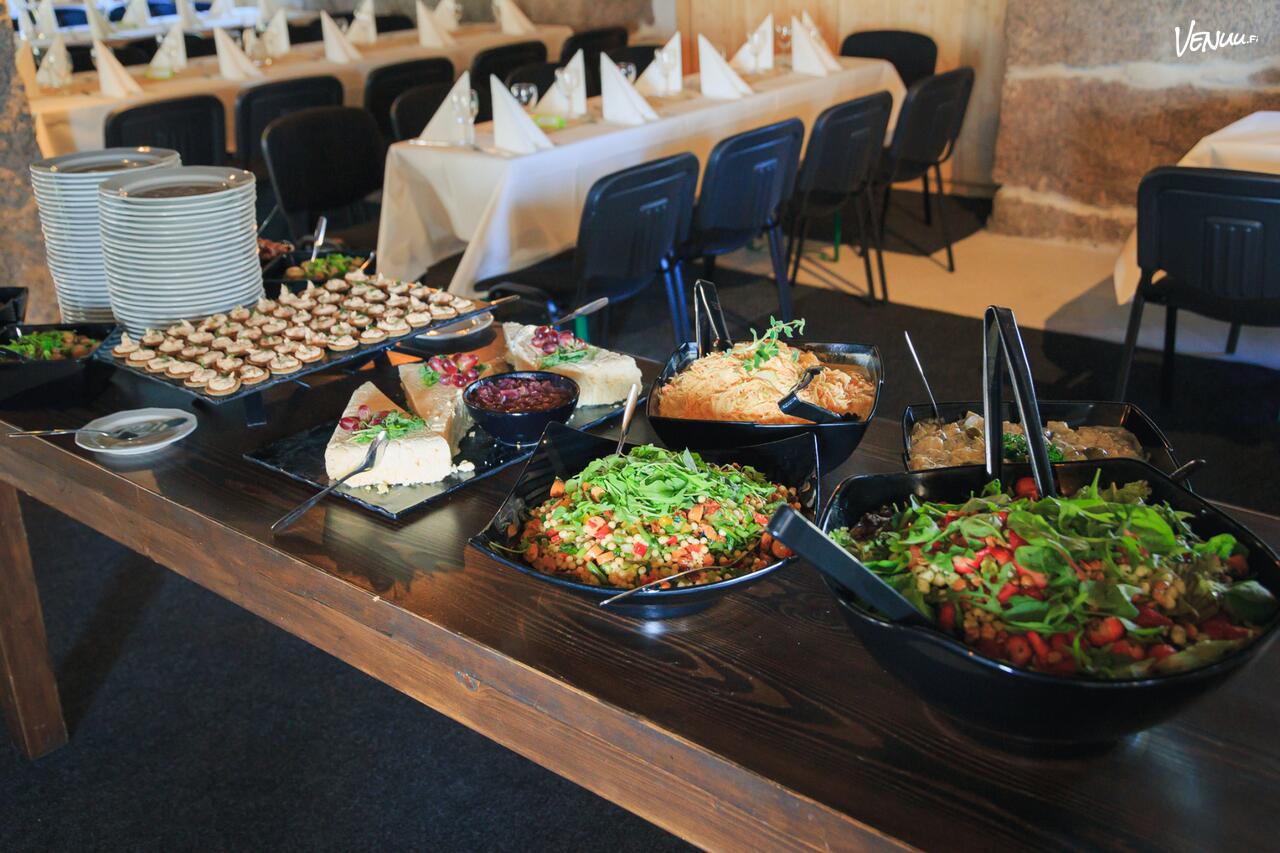Tarjoilut suunnitellaan yhdessä asiakkaan kanssa, joten menusta saadaan pikkujoulujen teemaan sopiva. Kalustoa ja resursseja löytyy monen kokoisiin tilaisuuksiin. Kylmä- ja keittiövaunut varmistavat ruokien katkeamattoman kylmäketjun, joten kokonaisuus toimii luotettavasti alusta loppuun!