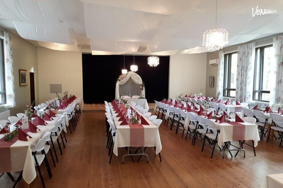 Yli satavuotias juhlarakennus huokuu historiaa ja kodikkuutta. Tilasta löytyy täysin varusteltu keittiö, tunnelmallinen juhlasali sekä laaja piha-alue, jonne mahtuu vaikka juhlateltta tai ulkotanssilattia! Astiastot, pihapelit ja ulkokalusteet täydentävät kokonaisuutta toiveidenne mukaan.