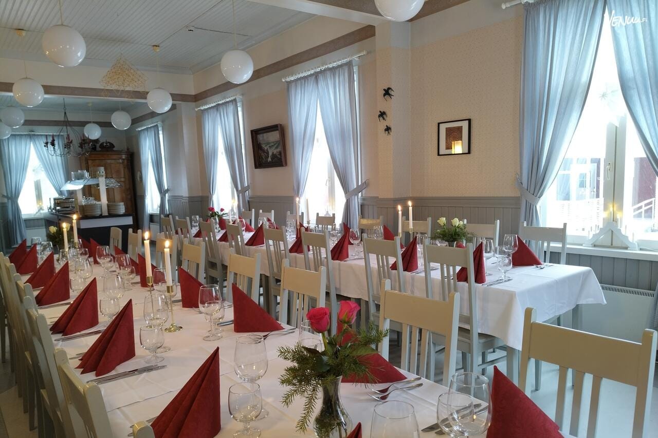 Juhlasalin lisäksi käytössä on 80 hengen ravintolatilan keittiöineen, joka tekee tarjoilujen järjestämisestä sujuvaa. Tänne voikin tuoda omat ruoat ja juomat, mikä tuo mukavasti vapautta.