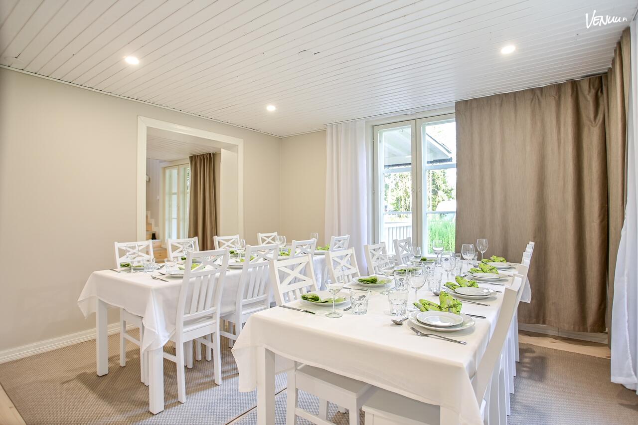 Tila sopii noin 20 vieraalle, ja paikan päältä löytyy myös majoitustilaa. Hyvin varusteltu keittiö, kaunis sisustus ja sujuva avaimeton sisäänkirjautuminen tekevät juhlista sujuvat ja viihtyisät! Täällä voit keskittyä nauttimaan tärkeästä päivästä läheistesi kanssa.