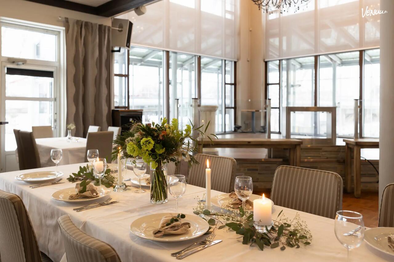 Lasitettu terassi, tanssilattia, bändille sopiva lava ja äänentoistolaitteet tekevät hääillasta elämyksellisen. Koska tilassa ei ole sitovia catering-palveluja tai anniskeluoikeuksia, voitte suunnitella tarjoilut ja yksityiskohdat täysin oman visionne mukaisesti!
