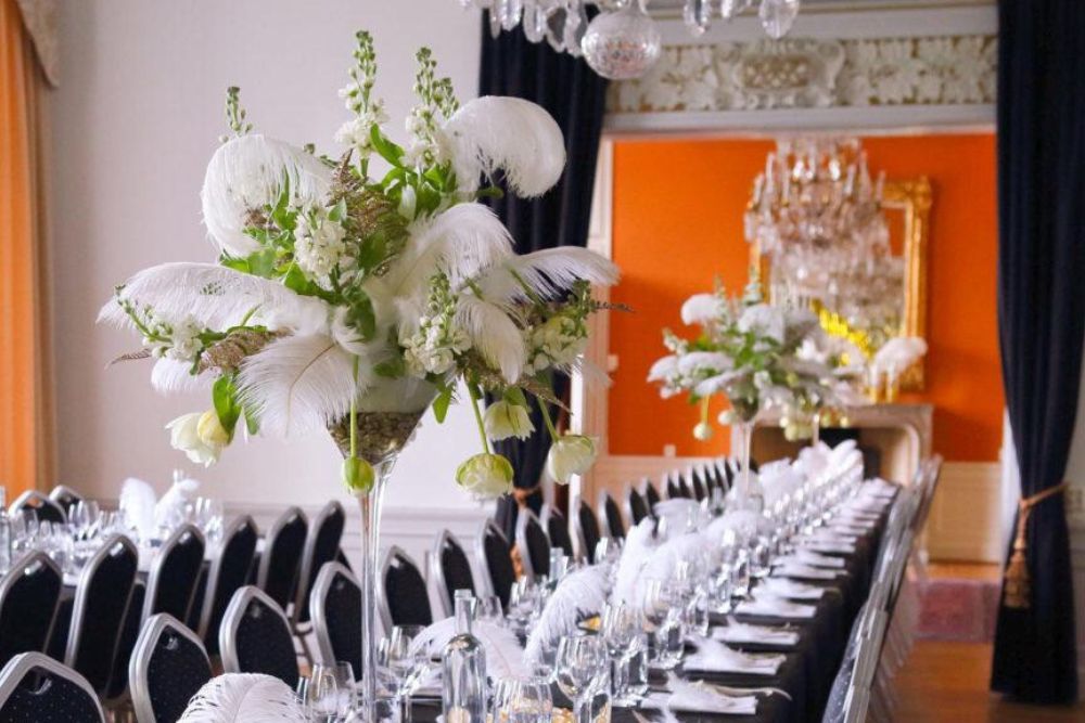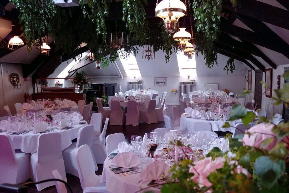 Loisteliasta juhlasalia koristaa näyttävät 1600-luvun kattomaalaukset ja upea takka. Salin suurista ikkunoista avautuu kauniit näkymät Ulfsundan lahteen samalla kun ne päästävät sisään runsaasti päivänvaloa. Häätilan vaikuttava kattokorkeus tuo juhlaan avaruuden tunnetta – se on myös teknisesti varusteltu päivän puheita varten. 🎤