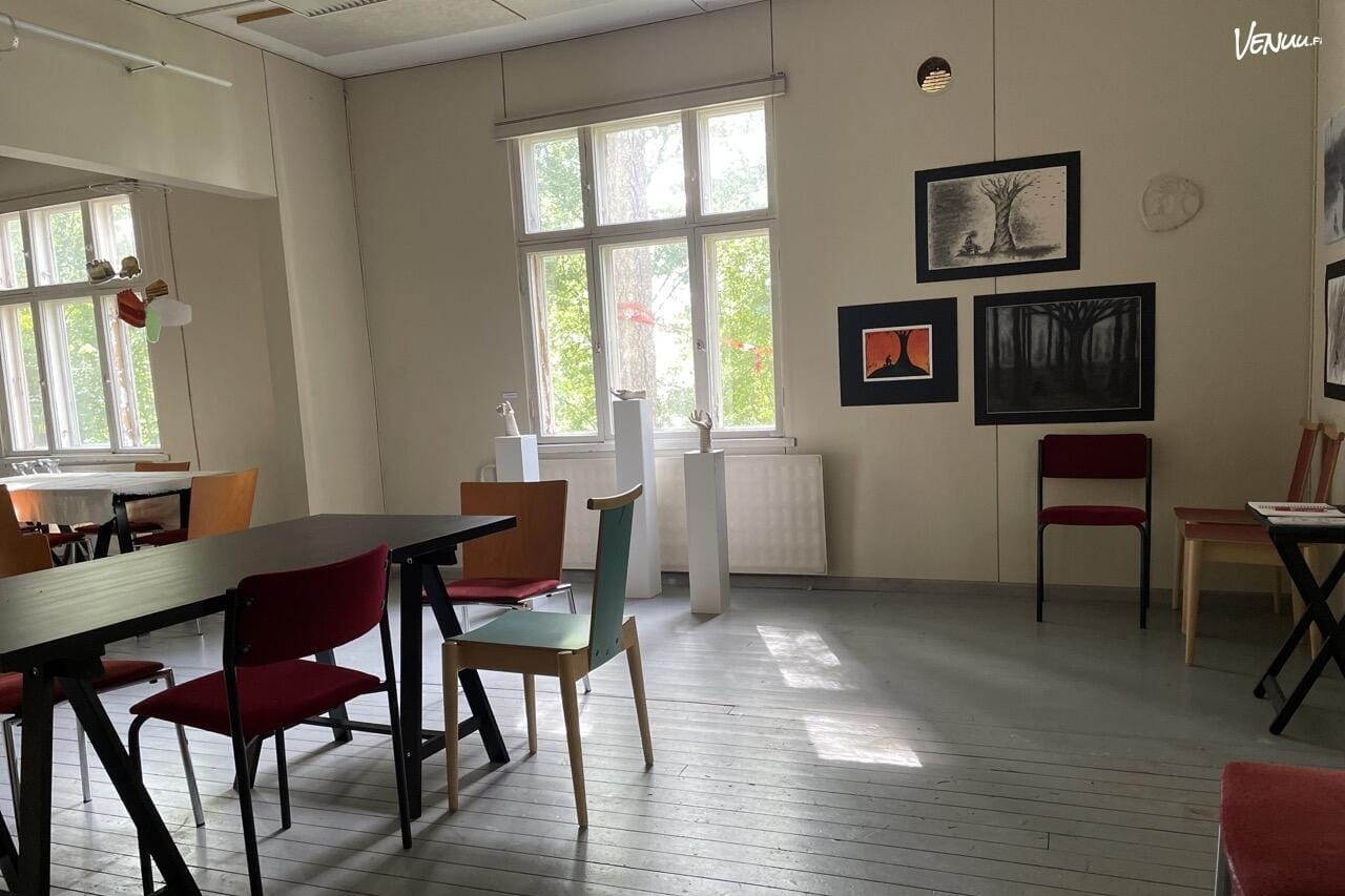 Pienempi kabinettitila toimii loistavasti esimerkiksi tarjoilujen esillepanoon ja suurempi parvialue toimii juhlien päänäyttämönä. Omat tarjoilut ovat sallittuja, ja käytössä on pieni keittiö kahvinkeittimineen ja jääkaappeineen.
