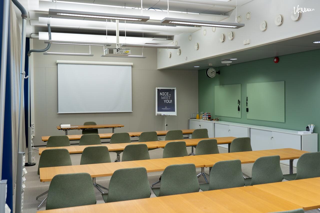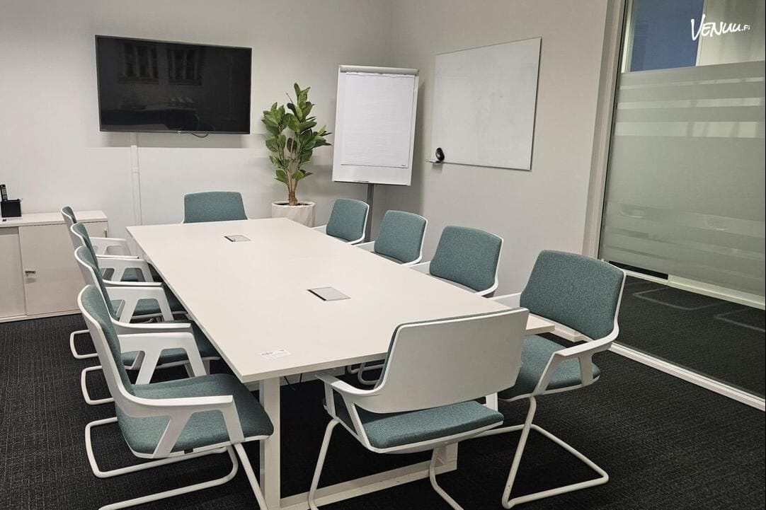 Tilaan mahtuu 16 henkilöä, ja pöytäjärjestelyjä voi muokata joustavasti eri kokoustyyleihin. Moderni kokoustekniikka mahdollistaa myös hybriditapahtumat ja videoneuvottelut.