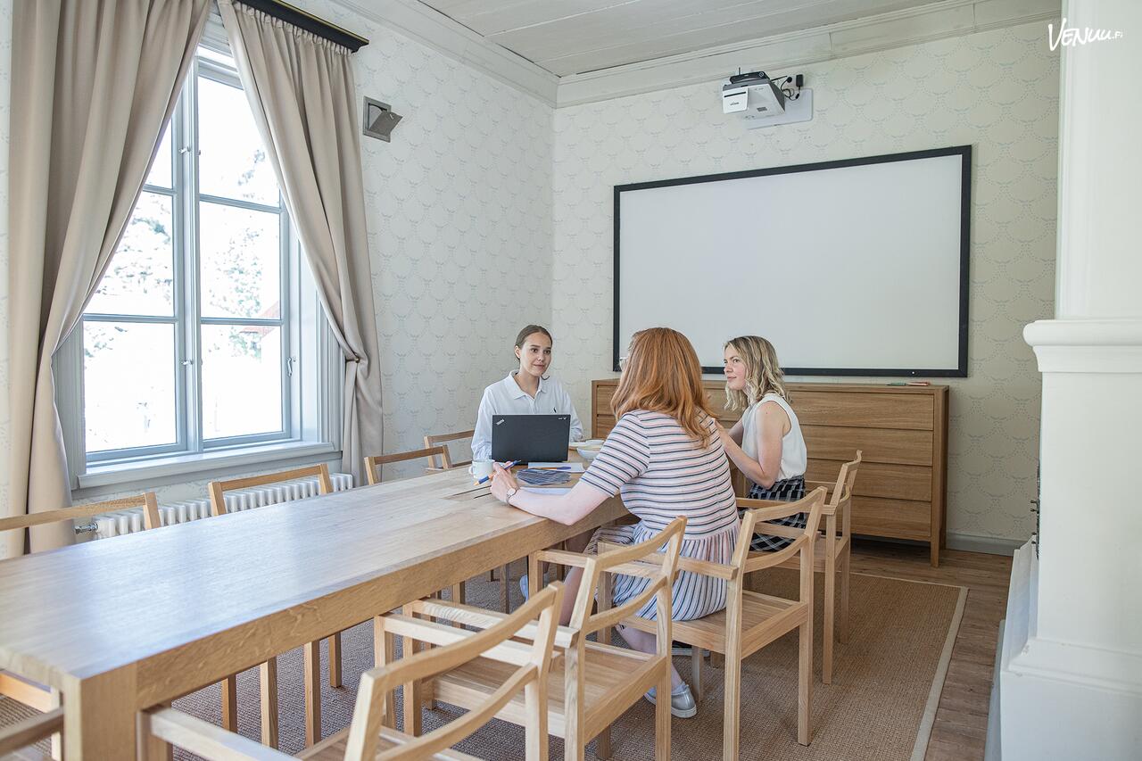 Tilassa on videotykki, valkokangas ja tarvittaessa fläppitaulu. Kesäkaudella lasiovet avaavat tilan suoraan terassille, mikä tekee kokouksesta entistä viihtyisämmän!🌞