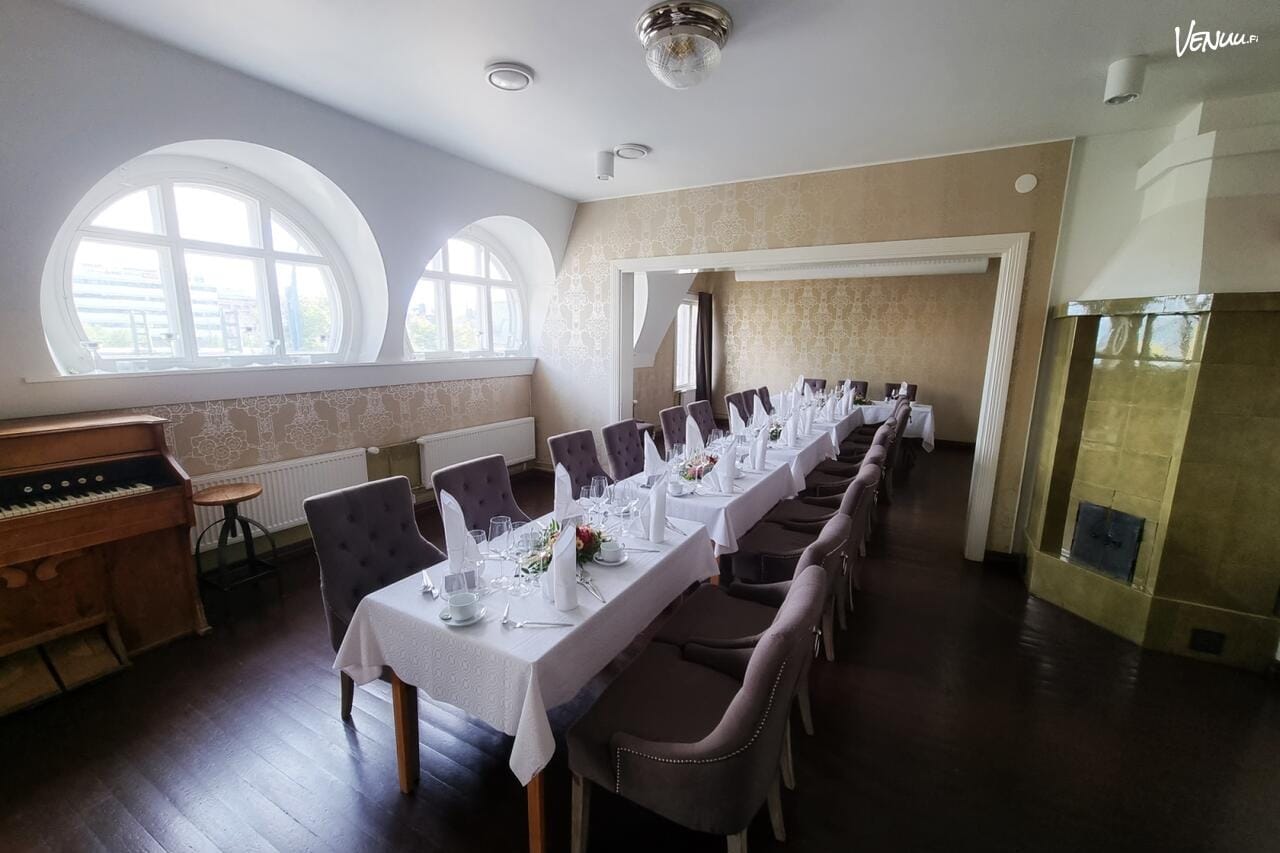 Alkuperäisen vihreän kaakelitakan ja kauniiden kaari‑ikkunoiden ansiosta tila tuntuu lämpimältä ja kutsuvalta. Juhlamenut järjestyvät ravintolan omasta keittiöstä, joten tarjoilujen järjestämisestä ei tarvitse huolehtia itse.