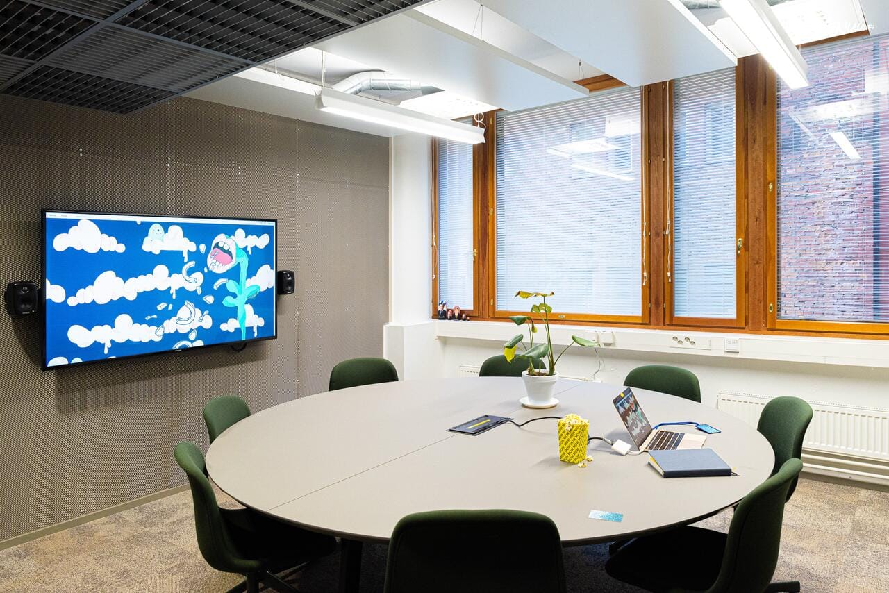 Tila on varusteltu isolla näytöllä, Genelec-kaiuttimilla sekä suurella valkotaululla. Tarjolla on myös keittiö, josta saa veloituksetta kahvia, teetä ja popcornia – pieniä iloja keskelle kokouspäivää.
