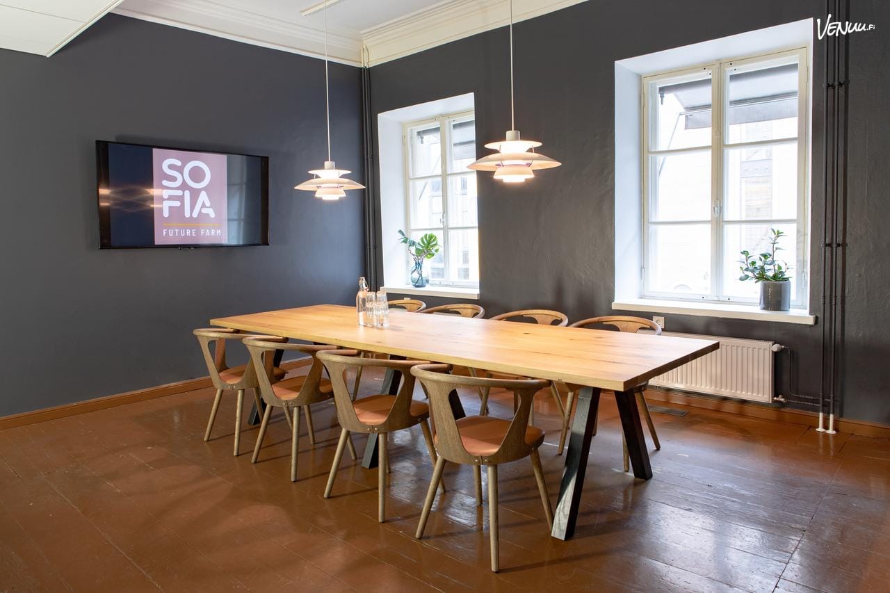 Kabinetista löytyy kaikki tarvittava: iso näyttö, fläppitaulu, langattomat yhteydet ja mahdollisuus hybridikokouksiin. Catering hoituu Sofian oman ravintolan kautta, joten herkut saa kätevästi pöytään.