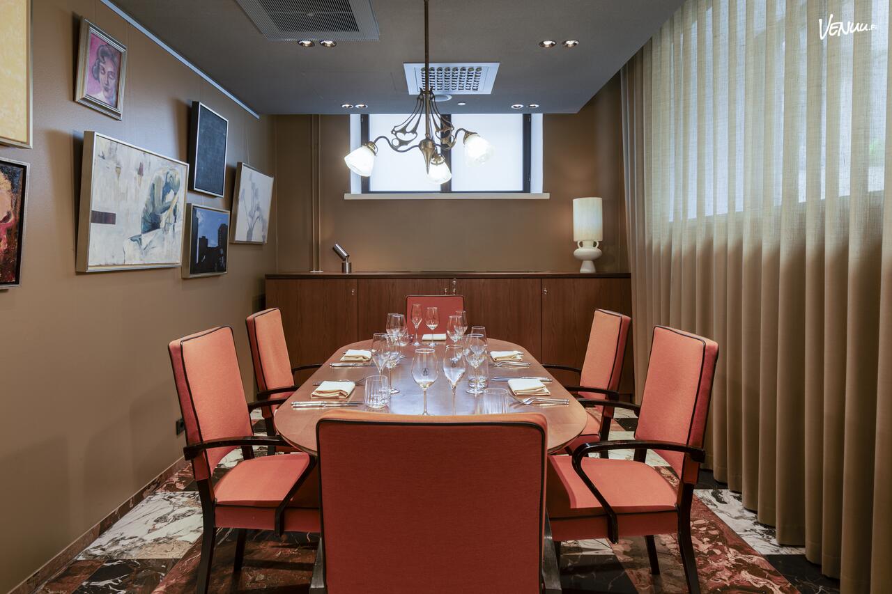 Kabinetti on sisustettu samoilla funkkistyylisillä materiaaleilla kuin ravintolasali, ja tilassa on yksi pitkä pöytä nahkatuolein. Tila toimii täydellisesti niin aamiais- ja lounastapaamisiin kuin illalliskokouksiinkin.