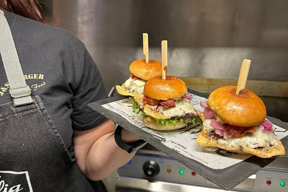 J&S Burger tuo liikkuvan burgervaunun pikkujoulupaikalle! Burgerit valmistetaan lähituottajan luomulihasta, ja kokonaisuutta täydentävät talon omat majoneesit.