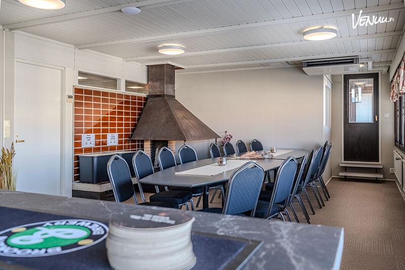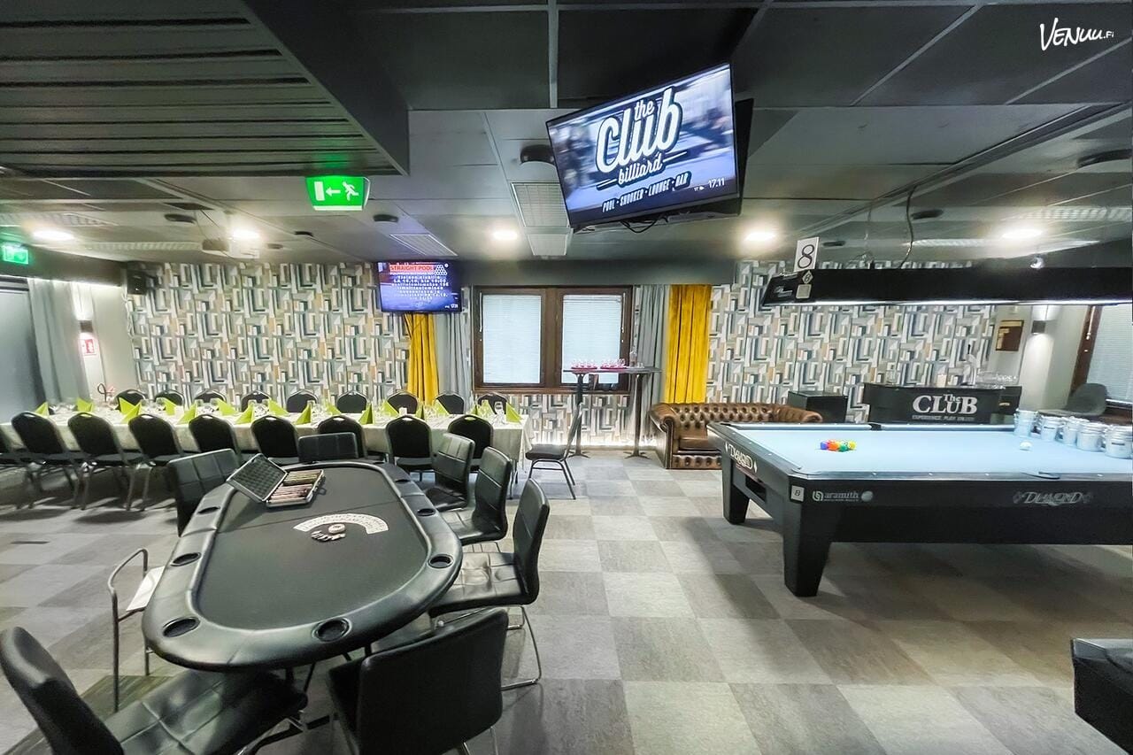 The Clubin koko kattokerros yhdistää rennon ruokailu- ja oleskelutilan, oman baarin, saunan kahdella pukuhuoneella sekä erillisen pelikabinetin biljardipöydällä ja dartstaululla. Kokonaisuus toimii erinomaisesti pikkujouluihin Vaasassa, joilta halutaan ruokailua, rentoutumista ja kevyttä kisailua.