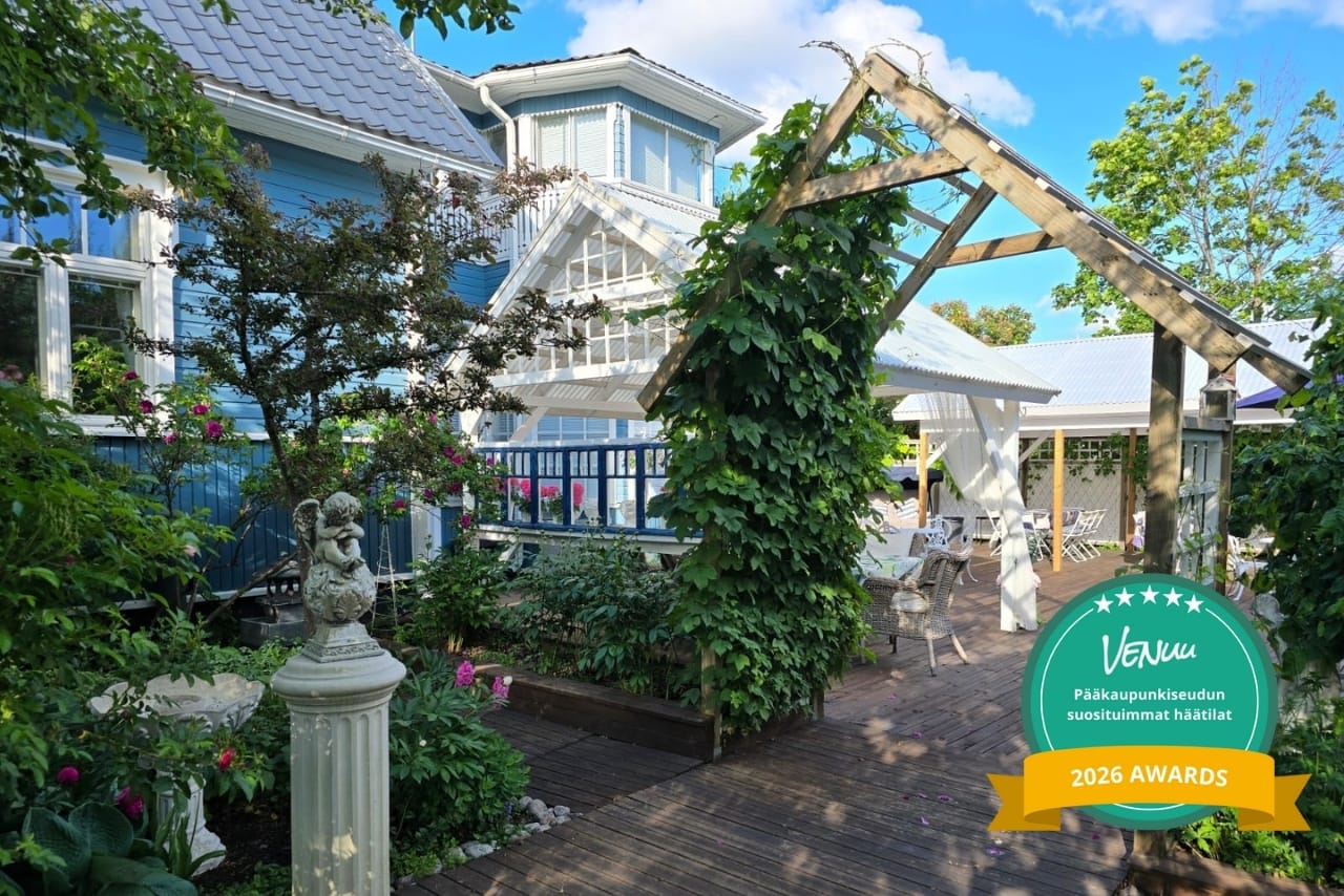 Mint Garden on hurmaava sininen puutalo, jonka ehdoton helmi on sen upea puutarha! Tilava patioalue juhlatelttoineen sekÀ vehreine köynnöksineen ja kukkineen luovat tÀydellisen paikan ikimuistoisille puutarhahÀille! Myös talon kauniit sisÀtilat toimivat loistavasti pienemmissÀ juhlissa.