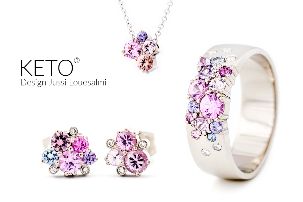 Au3 Kultaseppien tunnetuin koru on Jussi Louesalmen suunnittelema timantti-safiiri-sormus Keto, joka voitti Vuoden kaunein sormus 2017-kilpailun. Upean raikas ja värikäs korumallisto ihastuttaa ilmeellään ja epäsymmetrinen jalokivien asettelu tuo koruihin keveyttä ja leikkisyyttä. Koska laajasta korumallistosta löytyy niin sormuksia, korvakoruja ja kaulakorujakin, saa koruista luotua hääjuhlaan (myös tuleviin juhliin!) hienon, yhtenäisen kokonaisuuden!