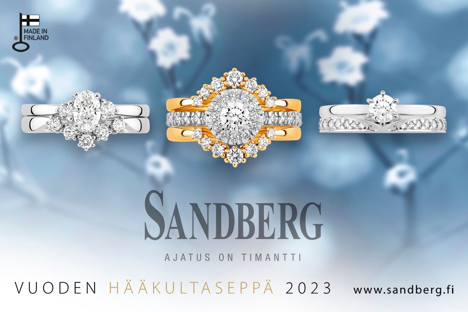 Vuoden 2023 hääkultasepäksikin kruunattu Sandberg suunnittelee ja valmistaa kaikki timanttikorunsa Suomessa! Korut valmistetaan aina pienissä erissä käsityömenetelmin, jolloin kultasepän kädenjälki pääsee oikeuksiinsa, laatu pysyy tasokkaana eikä turhia ylijäämiä synny. Yritys on saanut alkunsa jo vuonna 1960, josta lähtien korut on aina tuotettu asiakkaiden toiveita kuunnellen. Ehkäpä siksi Sandbergin suosio ei tunnu laskevan vielä yli 60 vuodenkaan jälkeen!