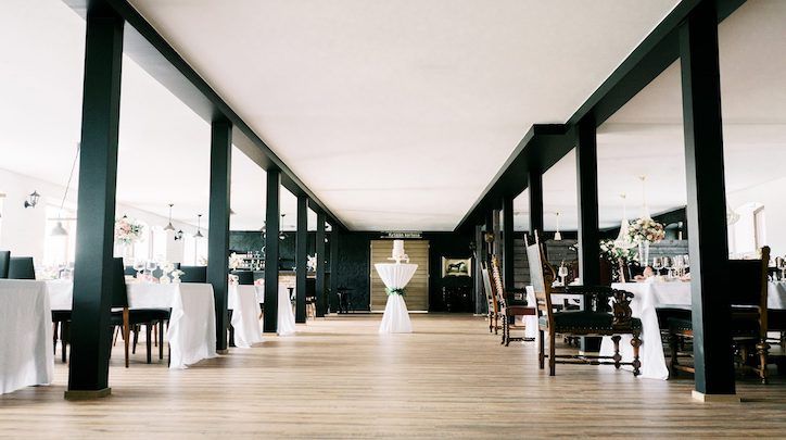 Industrial-henkiset lamput ja kattokruunut riippuvat avarassa tilassa sulassa sovussa. Tallin alkuperäiseen käyttötarkoitukseen viittaavat satulamaiset nahkatuolit, suuret mustat pylväät ja valkoiset tiiliseinät luovat persoonallisen tunnelman. Kauniisti suunniteltu valaistus korostaa sekä tilan että hääparin parhaita puolia.