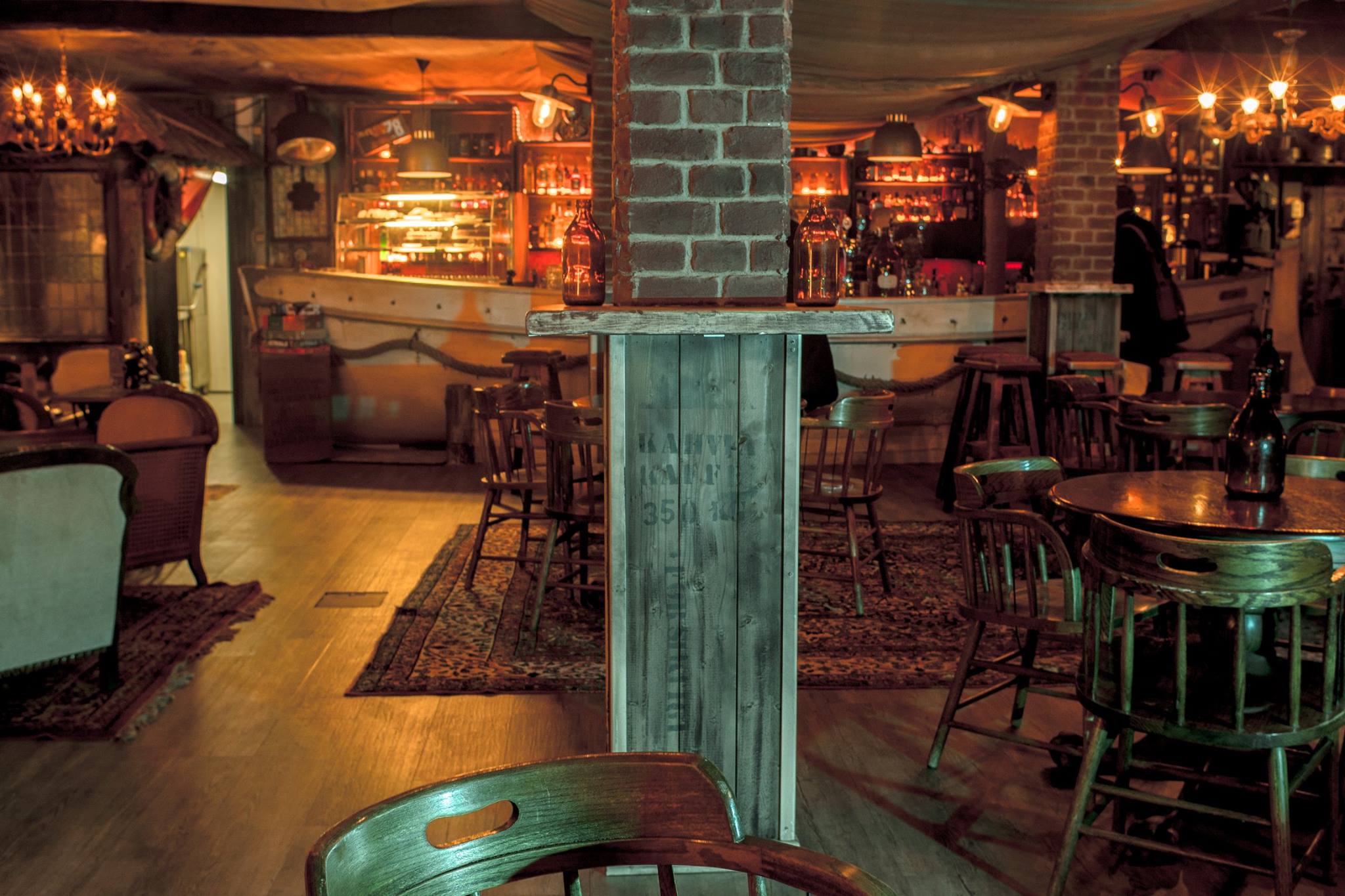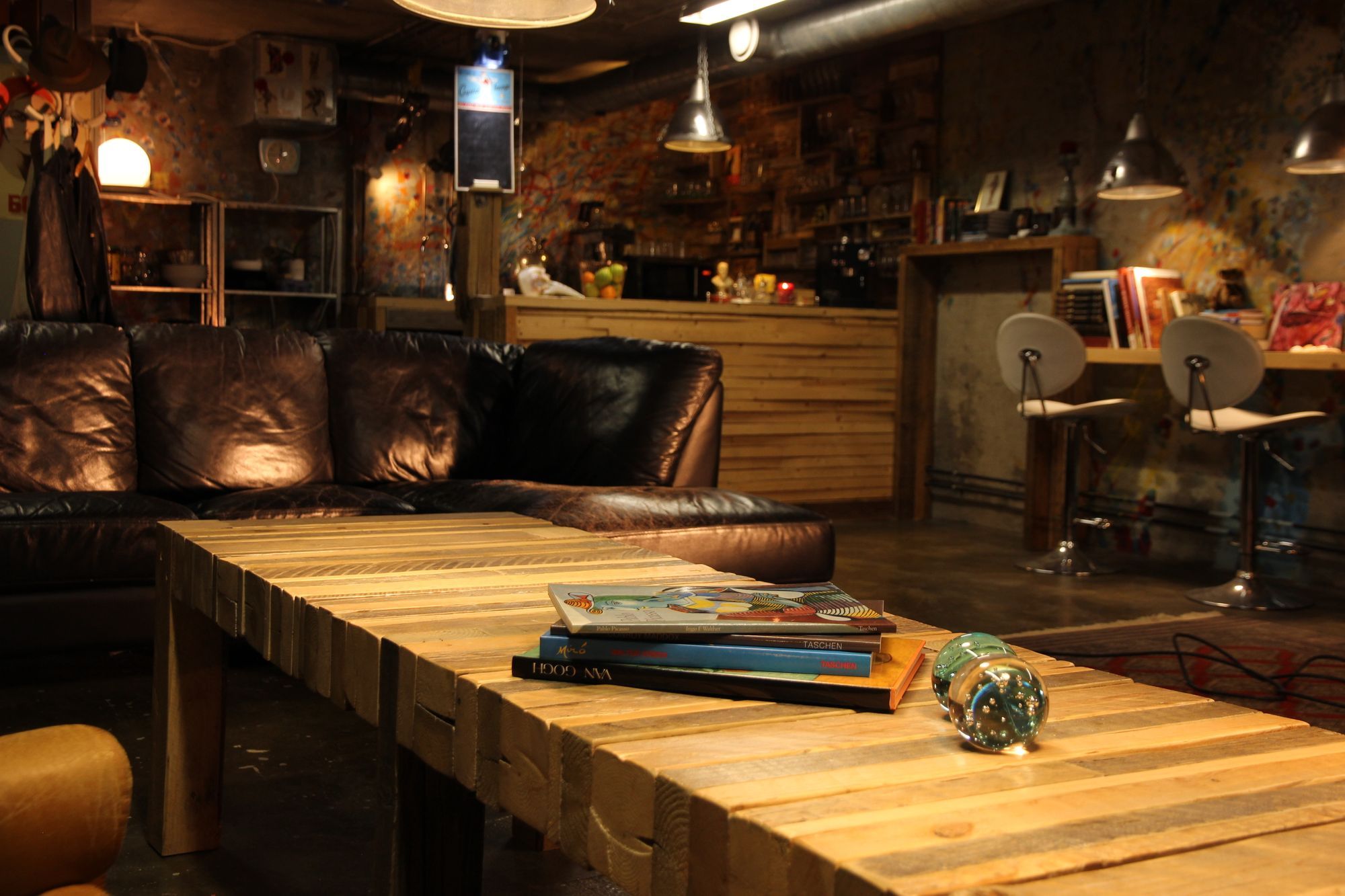 Venäläisen yltäkylläinen tila on täynnä hauskoja ja hulluja yksityiskohtia. Koko tilan kattavat betonilattiat, puolihämärä valaistus ja rohkea sisustus tekevät tunnelmasta rouhean ja karismaattisen.