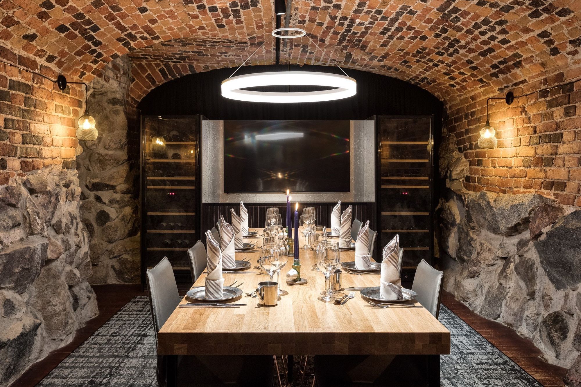 Tunnelmallinen, punatiilinen viinikellari kivenheiton päässä Helsingin keskustasta tarjoaa kaiken mitä juhla- ja kokousporukat tarvitsevat. 10 hengen viinikellarissa voit järjestää esimerkiksi viininmaistajaiset tai intiimin istuvan illallisen diplomaattipöydän ympärillä. Myös isomalle porukalle löytyy erilaisia tiloja selleistä kabinetteihin ja ravintolasalista vankilakirkkoon. Pallo jalkaan ja Katajanokalle!